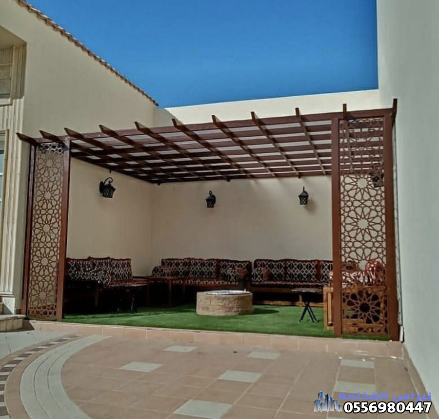 البرجولات الخشبية (الخشب المعالج): تضفي لمسة طبيعية ودافئة على الحوش. تُصنع عادة من الخشب البلاستيكي المعالج (WPC) أو الأخشاب المقاومة للعوامل الجوية، وهي مثالية لمن يبحثون عن مظهر كلاسيكي أو ريفي أنيق.