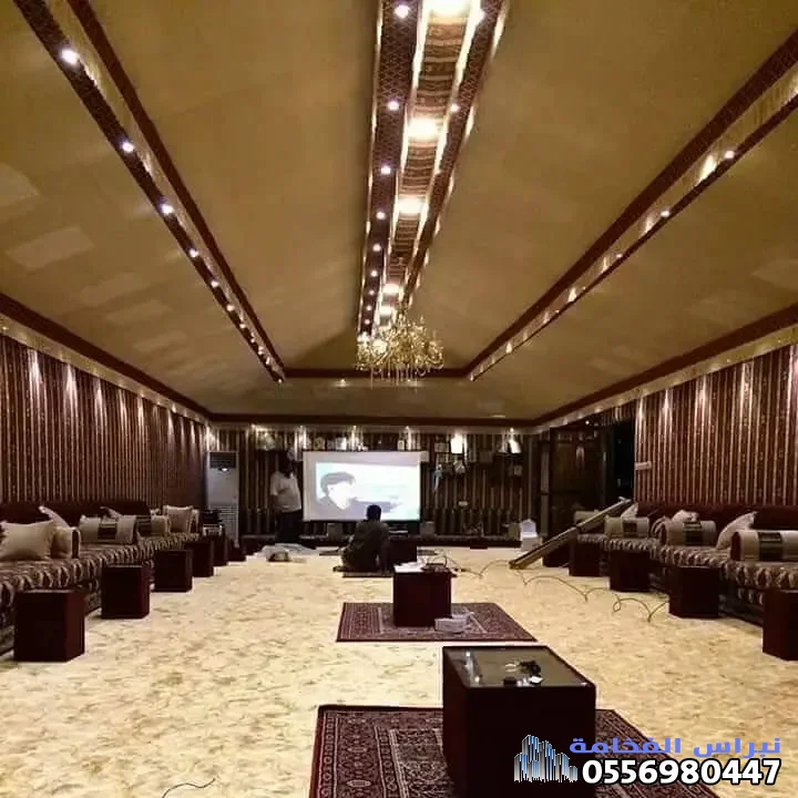 - الديكور الملكي الأصيل: يرتكز الديكور الداخلي على استخدام قماش السدو والبطانة القطنية المزخرفة، مع التركيز على الألوان الدافئة مثل الذهبي والبني والأبيض الملكي. يتم توفير أثاث فاخر من مجالس ومساند وطاولات بأعلى مستويات الجودة والذوق.