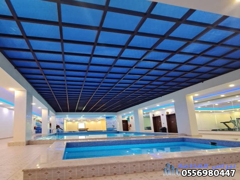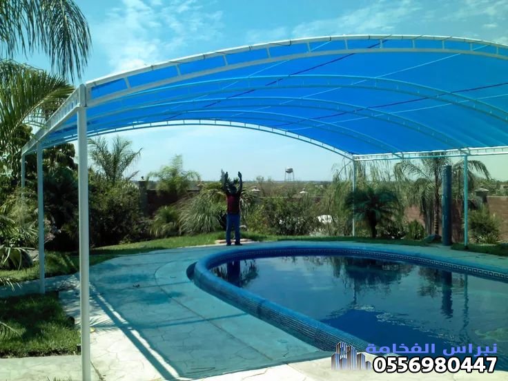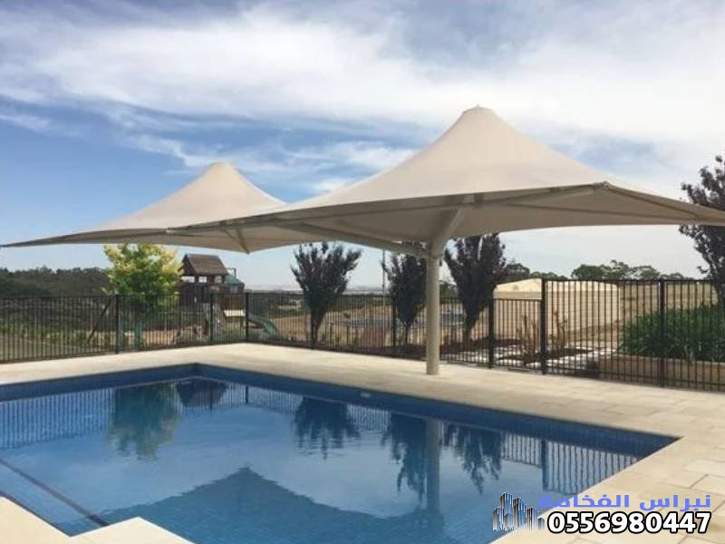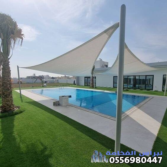 تُستخدم مظلات المسابح لتوفير الظل وحماية المياه من الأتربة والحشرات، مما يقلل من الحاجة إلى التنظيف المتكرر ويُطيل عمر المسبح. كما تضمن السواتر المحيطة بالمسابح الخصوصية التامة لمرتاديها.