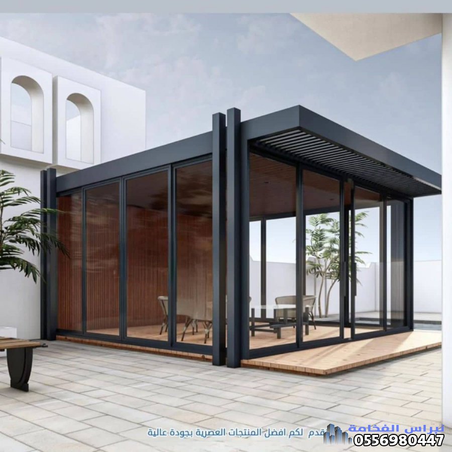 - نظام "اللوفر" الذكي: برجولات ذات شرائح قابلة للتحريك (يدوياً أو بالريموت)، تسمح لك بالتحكم في كمية الضوء والتهوية، مع نظام تصريف مياه أمطار مخفي.